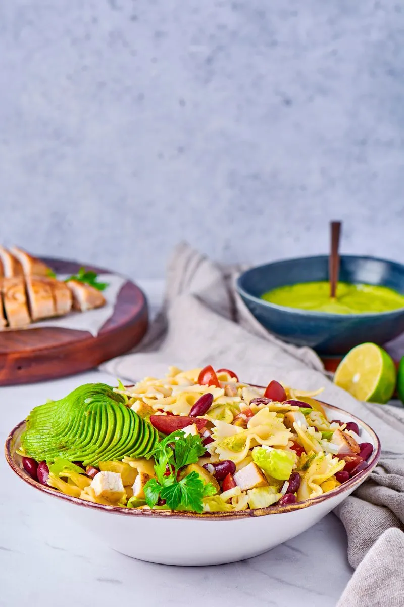 Cestovinový šalát s avokádom, kuracím mäsom a citrónovou omáčkou